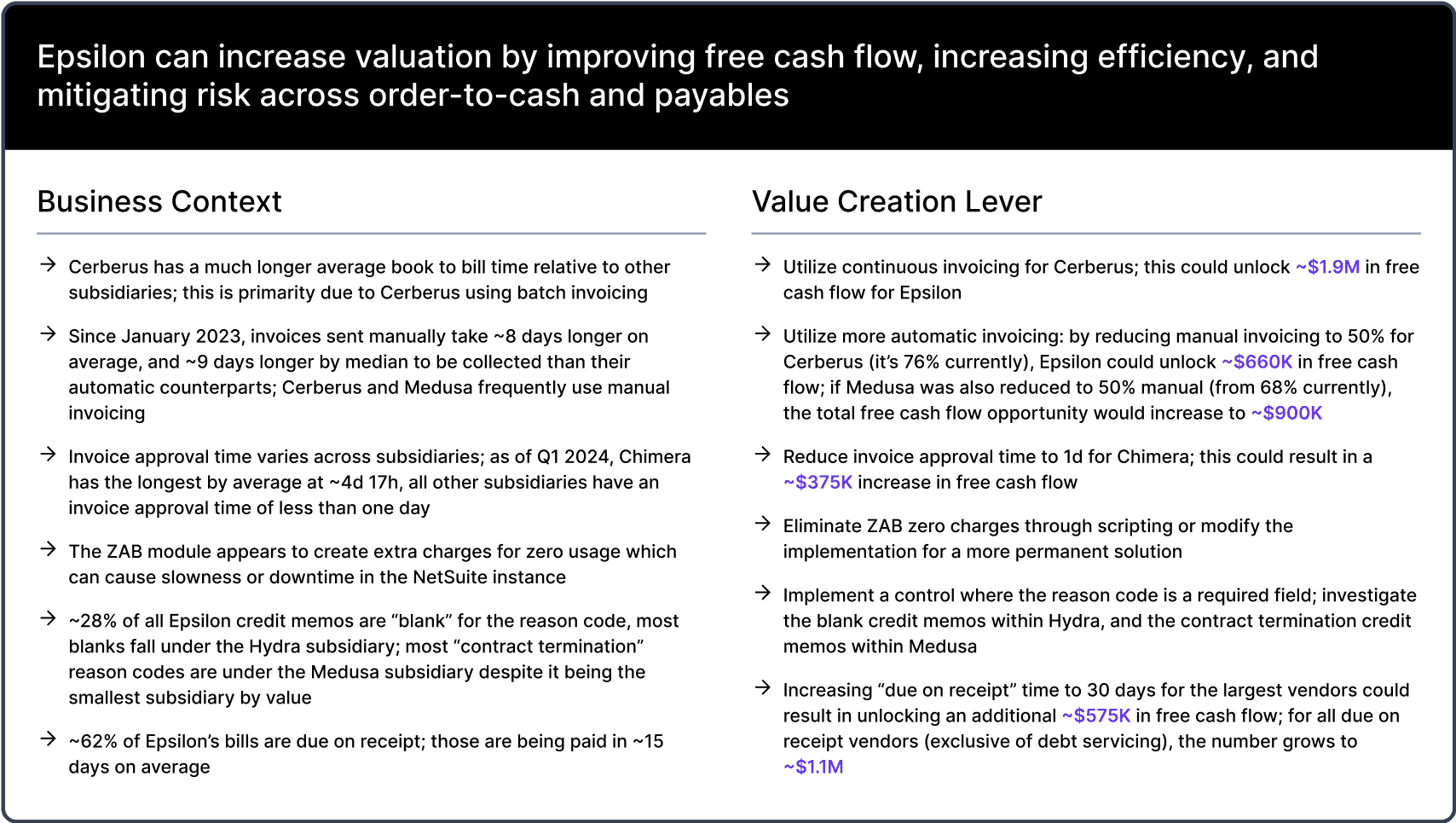 Objective findings with quantified impact for cash, NRR, and profitable growth.